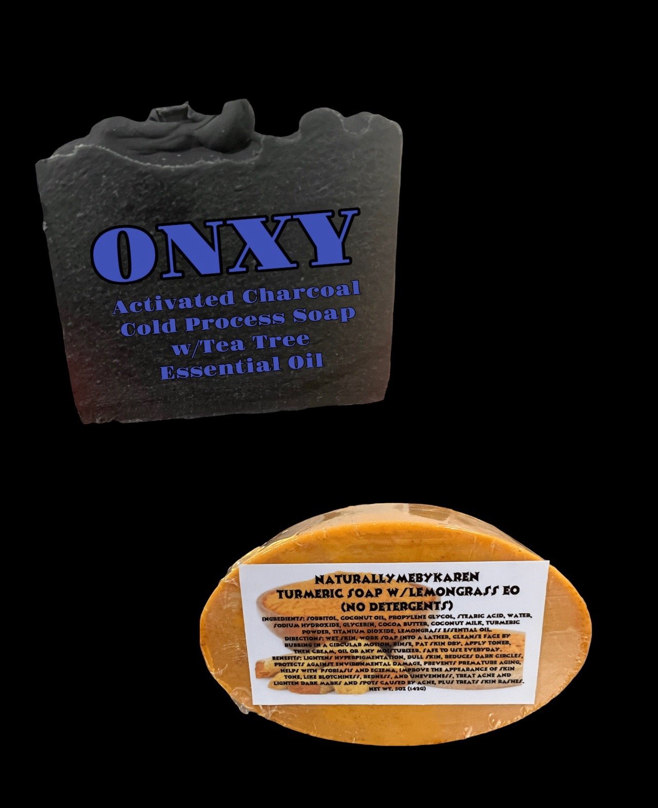 "ONYX" Activated Charcoal Cold Process Soap w/Tea Tree Essential Oil INGREDIENTS: ORGANIC EXTRA VIRGIN OLIVE OIL, COCONUT OIL, ALMOND OIL, COCOA BUTTER, SHEA