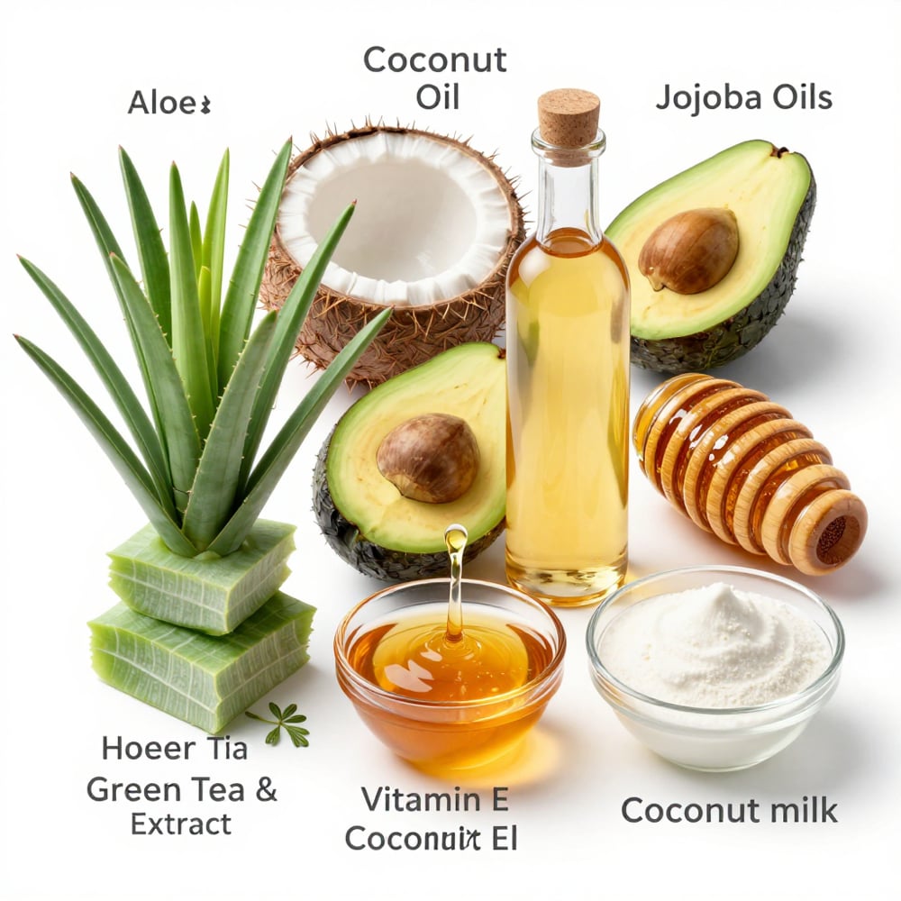 • Essential fatty acids (from oils like jojoba, argan, or coconut) – lock in moisture